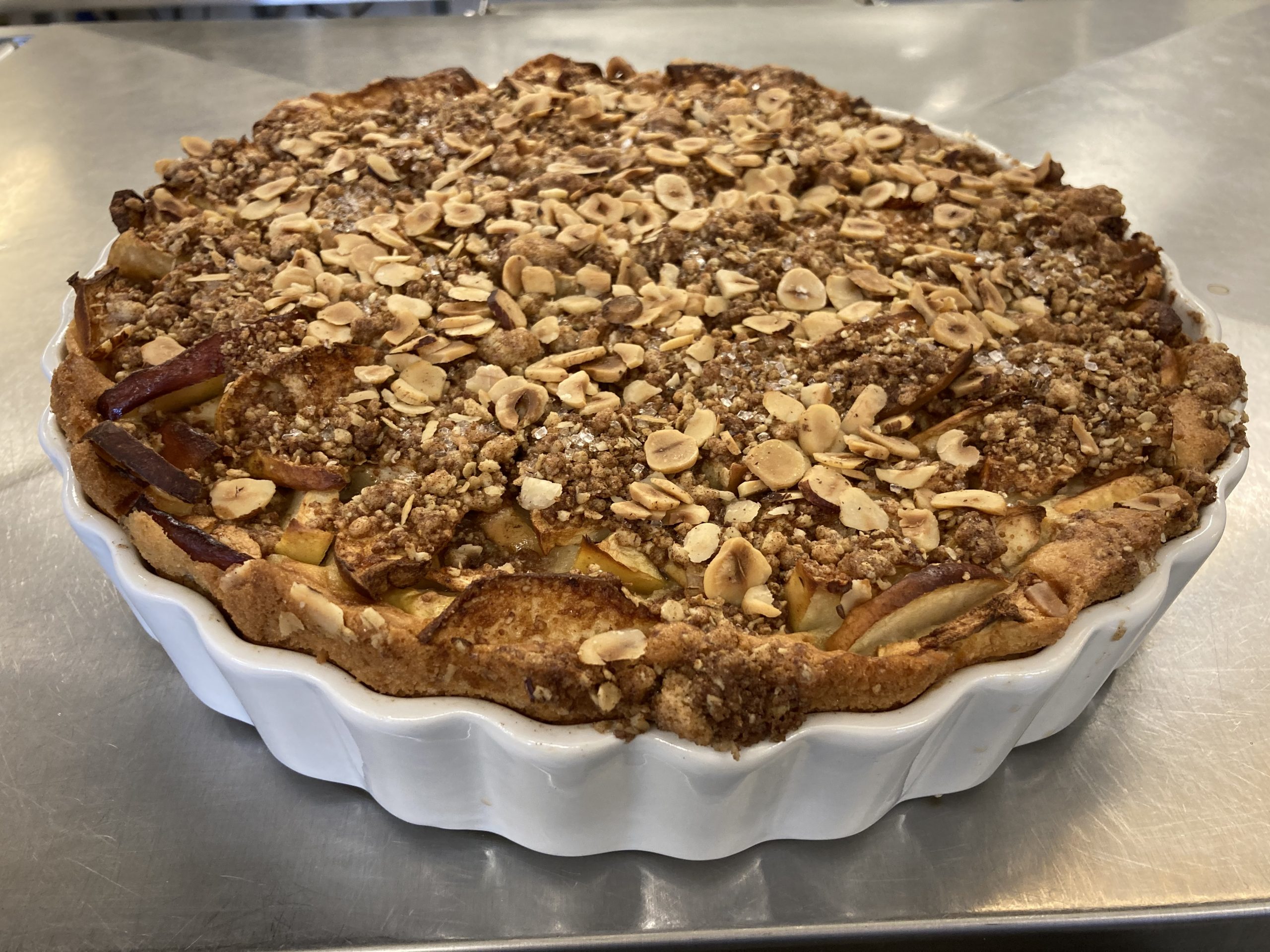 - Resten af drysset fordeles over æblerne. Pynt evt. med hasselnøddeflager.