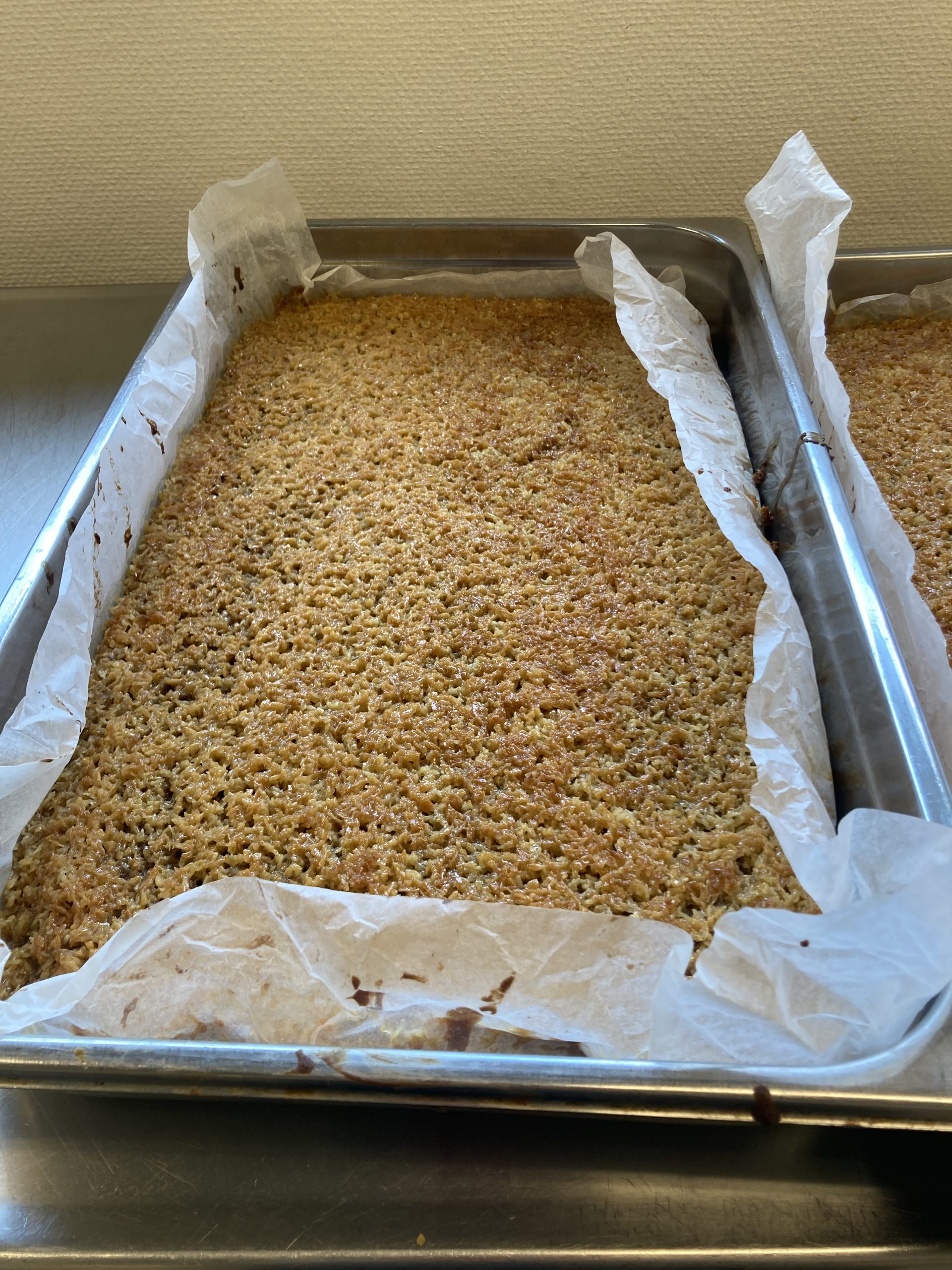 - Kom smør, sirup og sukker i en gryde og kog det op. Tilsæt fløde og kokosmel og rør det godt sammen.