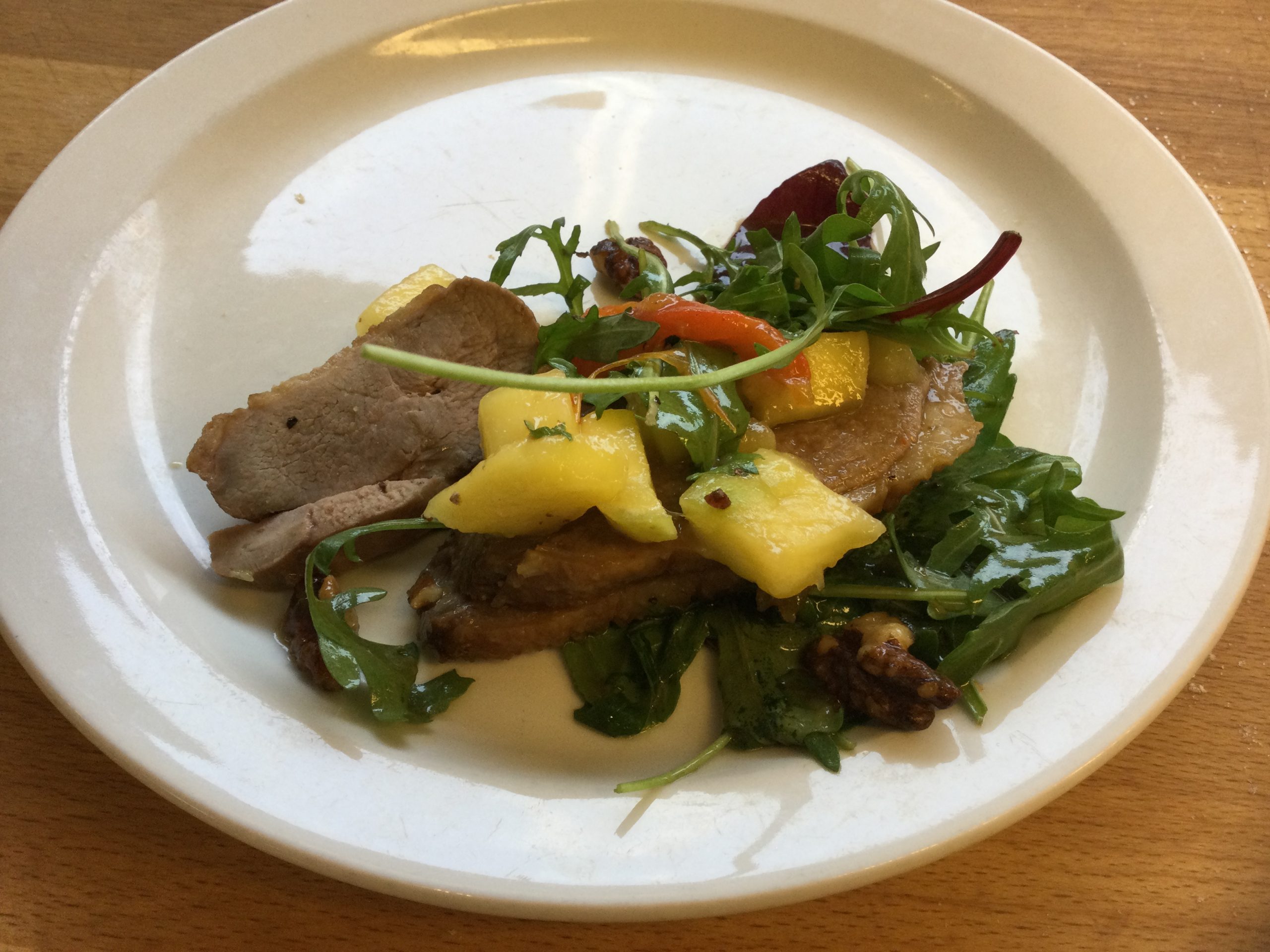 - Vend salat og peberfrugter med lidt af dressingen og anret det på et fad med and mangofrugter og nødder ovenpå.