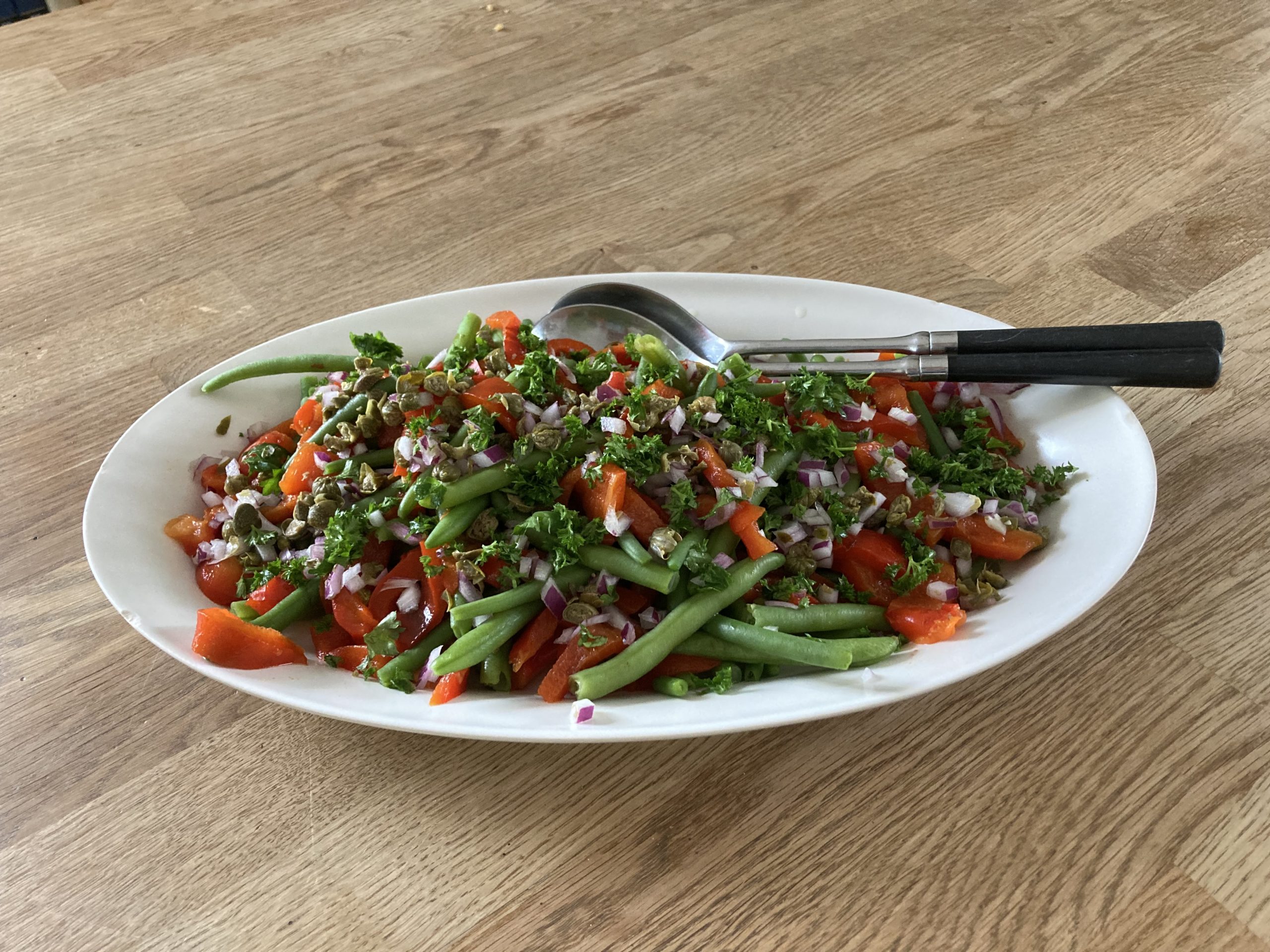 - Hvis salaten skal være mere mættende, kan der tilsættes kogte, skivede kartofler.